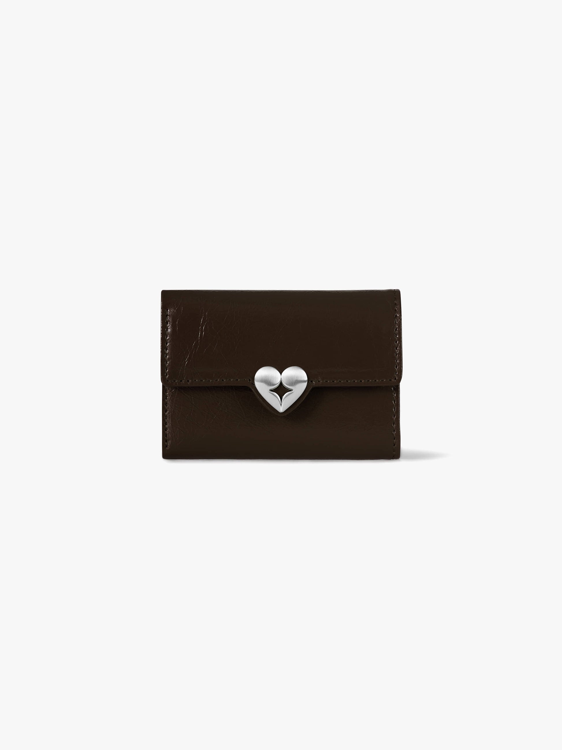 帶有心形標誌裝飾的銀包,閃亮、有皺摺紋理的牛皮材質。
